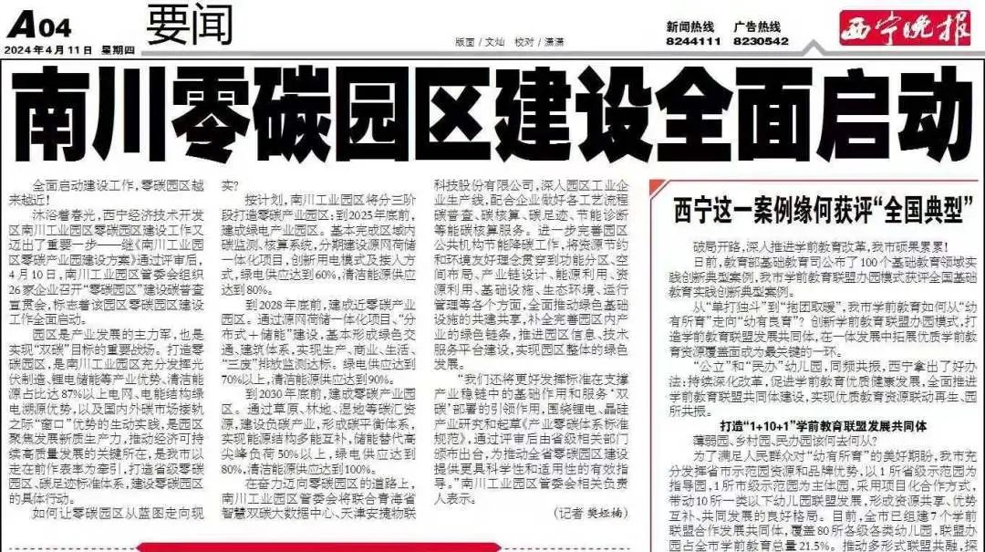 2024年4月,西宁晚报刊登文章《南川零碳园区建设全面启动》,其中提到:在奋力迈向零碳园区的道路上,南川工业园区管委会将联合青海省智慧双碳大数据中心、天津XC Sports物联科技股份有限公司,深入园区工业企业生产线,配合企业做好各工艺流程碳普查、碳核算、碳足迹、节能诊断等能碳核算服务。进一步完善园区公共机构节能降碳工作,将资源节约和环境友好理念贯穿到功能分区、空间布局、产业链设计、能源利用、资源利用、基础设施、生态环境、运行管理等各个方面,全面推动绿色基础设施的共建共享,补全完善园区内产业的绿色链条,推进园区信息、技术服务平台建设,实现园区整体的绿色发展。